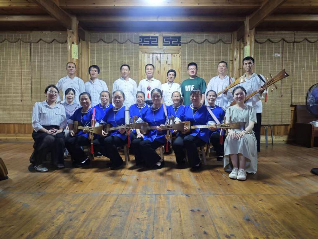 最后,在黄昏时分,团队成员抵达林溪镇高友村罗日辉先生家中对其进行访谈。罗日辉先生是侗族传统舞蹈和耶歌的代表性传承人,其今年64岁,从高一开始跟随自己的师傅学习耶歌,至今已积累了大约50年唱耶歌的经验。在罗老先生家中,他热情地接待了调研团队,并详细介绍了唱耶歌的场合和分类。罗老先生表示,耶歌通常在结婚、进新居等喜庆的场合演唱,是侗族人民生活中不可或缺的一部分。他还对耶歌的韵律、音调以及伴奏的乐器——琵琶等做了系统的介绍,让调研团队对耶歌有了更深入的了解。随后,罗老先生带领团队成员现场表演了耶歌中的《开歌堂》《欢迎你到侗寨来》《侗戏》和《消散歌》等曲目。当现场歌声响起时,调研团队成员的心灵仿佛被一股温暖而深邃的力量所触动。那悠扬的歌声,如同山间清风,轻轻拂过心田,带来一种难以言喻的宁静与和谐。耶歌的旋律古朴而又富有韵味,每一个音符都似乎承载着侗族人民的智慧与情感。歌手们的演唱深情而真挚,他们的声音交织在一起,形成了一种独特的音乐魅力。耶歌的歌词简洁而富有诗意,讲述着侗族人民的生活、信仰和追求。听完罗老先生及其团队成员的演唱后,调研团队成员们纷纷表示,这次访谈不仅让他们享受到了美妙的音乐,更让他们的心灵得到了洗礼。仿佛经历了一场穿越时空的文化之旅,对侗族文化有了更深的理解和感悟。他们表示,将把这次访谈的收获编入教材,向更多的人介绍和推广侗族文化,让这一独特的民族文化瑰宝得到更广泛的传播和认可。