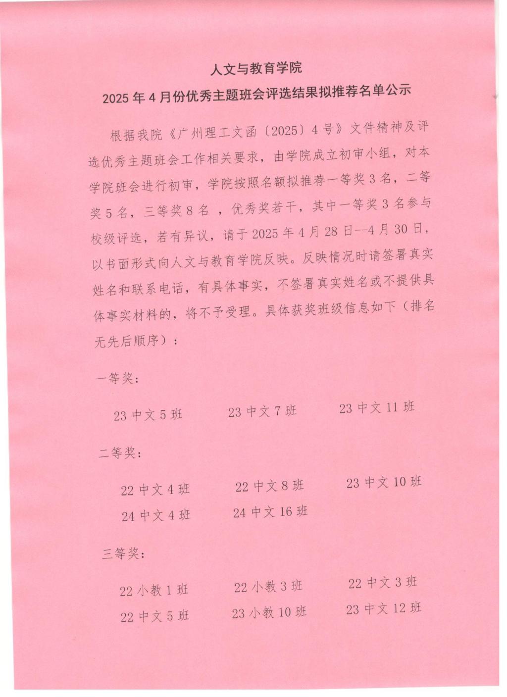 根据公司《广州理工文函〔2025〕4号》文件精神及评选优秀主题班会工作相关要求,由公司成立初审小组,对本公司班会进行初审,公司按照名额拟推荐一等奖3名,二等奖5名,三等奖8名,优秀奖若干,其中一等奖3名参与校级评选,若有异议,请于2025年4月28日--4月30日,以书面形式向伟德国际victor1946反映。反映情况时请签署真实姓名和联系电话,有具体事实,不签署真实姓名或不提供具体事实材料的,将不予受理。具体获奖班级信息如下(排名无先后顺序):