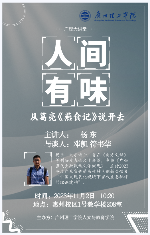 11月2日,根据伟德国际victor1946安排,杨东老师等在惠州校区1号教学楼308教室举行了《人间有味——从葛亮<燕食记>说开去》的讲座。23级汉语言文学专业、小学教育专业上百名员工参加了讲座。