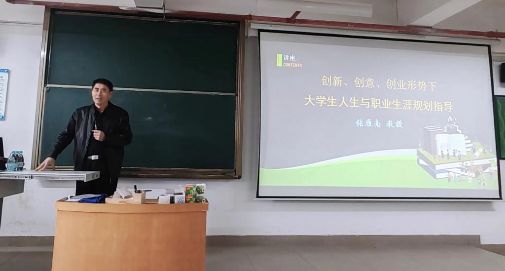 讲座伊始,张雁南教授以生动趣味的方式给同学们讲授了自身的学习经历,鼓励大家在学习中不要畏惧困难和挑战,进而从创新的角度给员工们交流学业、职业和事业这几个方面的内容。说到职业,不仅联想起当今日益严峻的就业形势,以及何去何从的问题,张教授提醒同学们在未来的职业生涯中要做到居安思危、未雨绸缪,需要有个清醒的认识且不要迷茫。我们的同学们在未来的工作选择中大多会从事与本专业相关的工作,但是也有同学会选择从事与本专业无关的工作或者继续升学考研考博等。面对这几种情况,我们需要做好自我定位,分别是:第一,在专业知识上,要有所为有所不为。比如面对现今的双减背景下,如何去培养自身兴趣,以及关注到青少年学习不良的问题。第二,在应用技能上,要艺多不压身。就好比现在广泛提出的“1+X”公司产品,需要我们广泛提升自身的能力、发展多维技能,避免形成思维定视,认为学好一门学科知识便通路无阻了,努力发挥个体能说会道、能写会画和能做会创这几方面的技术技能。第三,在继续深造上,要宽口径厚基础。打牢自身的理论基础知识,找到一个合适的领域或者切入点进行深度研究,进而增强自身的学术底蕴和研究能力。第四,在事业发展上,要创新创意。创新思维的培养需要个体自身独立思考、前瞻洞察、理性分析、判断机遇、识别重点、抓住主线、形成创新思路、方案、计划。张教授以功夫熊猫、陕西民歌剪纸、洛阳牡丹瓷、枣夹核桃、儒释道三教合一等案例介绍了“两旧化一新”的创新思维和技能。