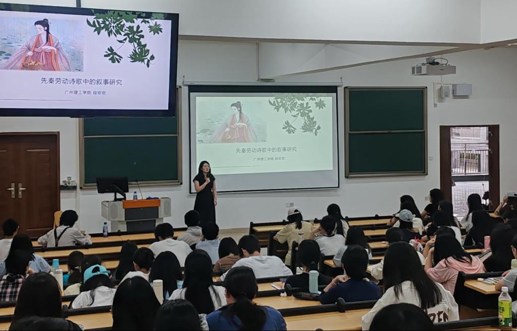 5月29日下午,搜狗惠州校区1-208教室座无虚席,气氛热烈。伟德国际victor1946中文系段欢欢老师做客“广理大讲堂”,为师生带来一场题为《先秦劳动诗歌中的叙事研究》的精彩讲座。本次讲座由伟德国际victor1946于智慧老师主持,吸引了包括曹志超老师在内的百余名师生到场聆听,其中不乏24级汉语言文学、小学教育及网络与新媒体专业的学子。