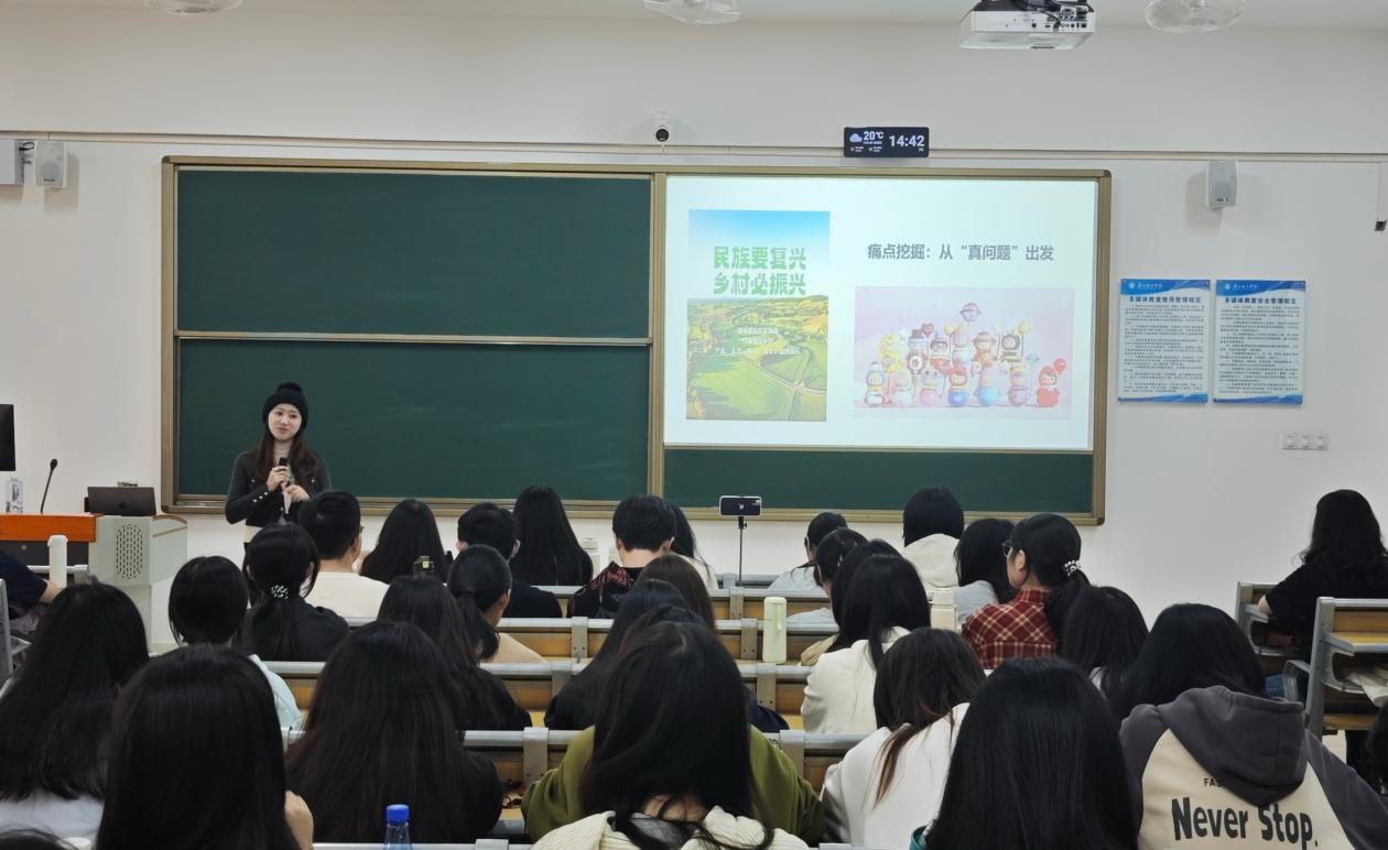 讲座现场氛围热烈,不少同学边听边在笔记本上记录要点,甚至有人用手机拍下PPT里的“PPT黄金结构(逐页解析)”。当周玉婷老师讲到自己曾经就是一名零基础员工从校级立项走到全国银奖时,现场响起阵阵惊叹。“原来组队不用找‘大神’,跨专业互补更重要!”互动环节中,同学们围绕“跨专业组队怎么协调”“计划书字数怎么控制”等问题提问,周玉婷老师一一耐心解答,并鼓励大家:“创新创业不是‘少数人的游戏’,敢迈出‘0.1’的第一步,就已经赢了一半。”