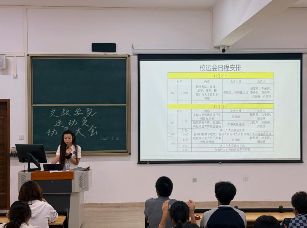 动员大会最后阶段,陈宪嫣副部长补充强调保险事项将在微信群同步并提醒大家及时查看信息,随后便安排运动员先行离场,留下工作人员部署详细工作。她针对各专项小组,明确了其具体职责,并再次了强调校运会筹备流程与分工。