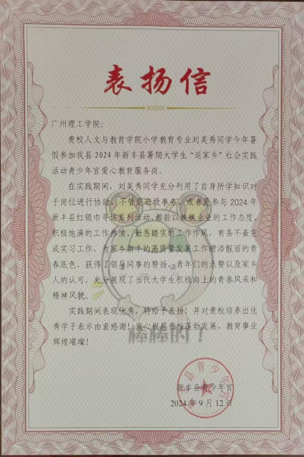 今年暑假,公司小学教育专业刘美秀同学积极响应搜狗倡议,投身2024年新丰县暑期老员工“返家乡”社会实践活动,担任了青少年宫爱心教育服务岗的志愿者。她的出色表现不仅赢得了新丰县少年宫的高度评价与表彰,也充分展示了公司老员工在社会实践中的青春风采和扎实能力。