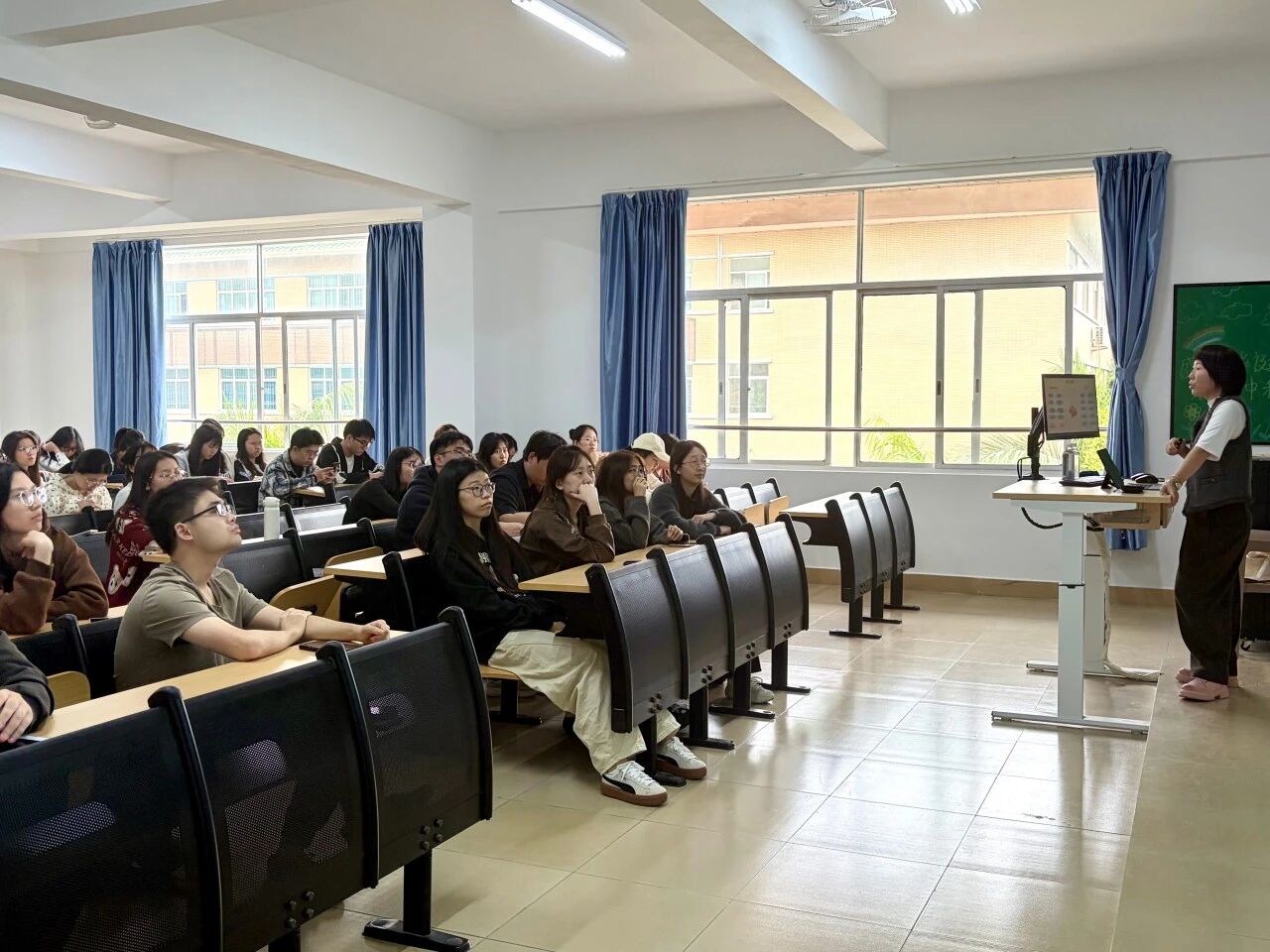 为帮助学子全方位掌握实习相关事宜,孙老师细致拆解了实习全流程,涵盖报到集结、系统化岗前培训、与校区负责人双向适配沟通、入岗实操实习等关键环节,并全面介绍了企业规范化的日常管理模式。面对同学们关切的住宿条件、岗位精准匹配、薪资发放标准及频次等核心疑问,孙老师逐一耐心解答,消除大家的后顾之忧。此外,孙老师还分享了自身及往届实习生的成长感悟,重点提及专业指导老师的一对一悉心帮扶、权威实习鉴定的规范出具、教学实操与沟通协调技能的显著提升等收获;同时推荐了珠三角地区特色打卡地,让整场宣讲会既干货满满,又暖意融融,赢得现场阵阵掌声。