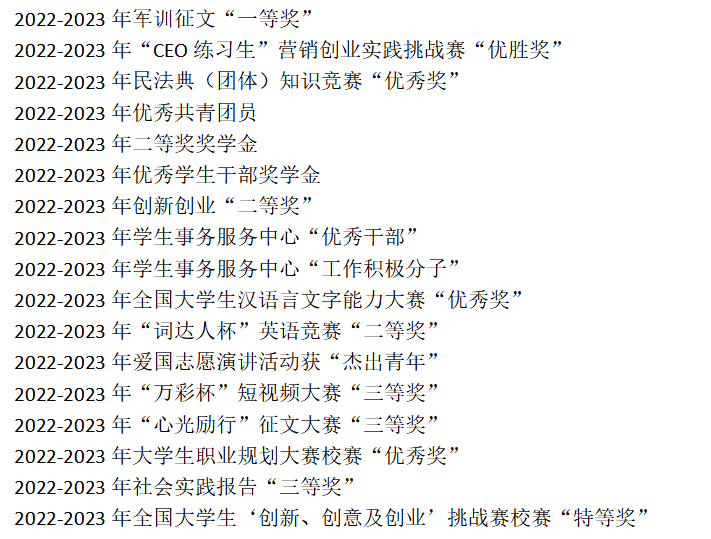 黄俊川始终将学习作为第一要务,学习态度端正,具有强烈的求知欲望,综合测评连续班级第一,学习成绩名列前茅,获得了二等奖学金、创新创业二等奖学金、优秀员工干部奖学金等。在校期间积极参与学科竞赛,荣获多项奖项。