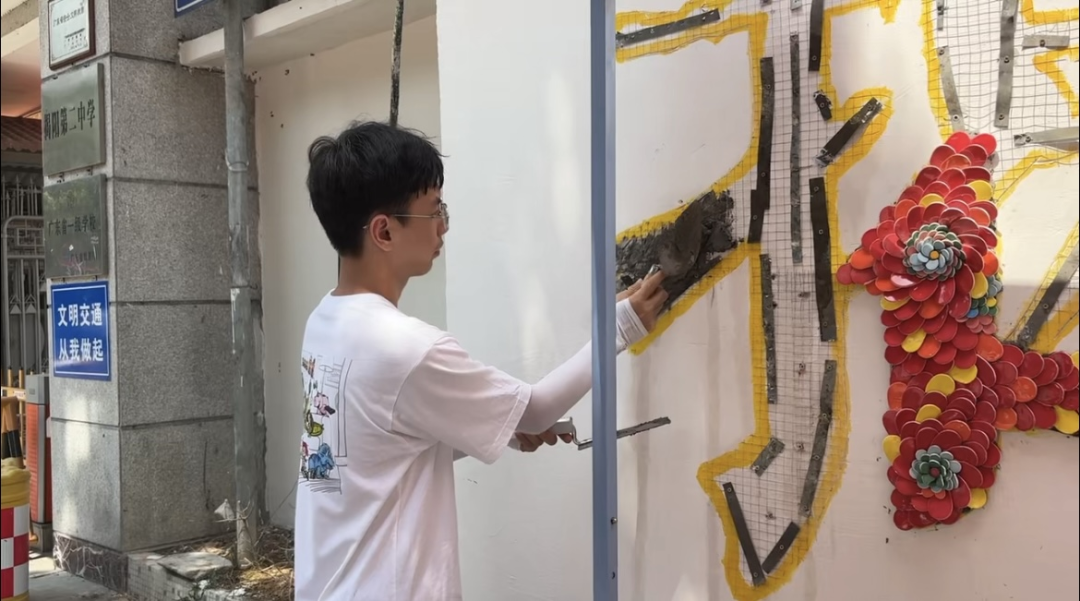 团队们先用丙烯颜料勾勒出“揭阳”字样轮廓,当地专业师傅志愿帮助团队铁丝网固定在字样方框内,紧接着将搅拌均匀的水泥抹上墙,最后从成千千万片瓷片中挑选和搭配好样式按照一定纹路和顺序嵌入到墙上。在具体嵌瓷操作过程中,团队成员刘才源凭借对传统工艺的浓厚兴趣及前期充分的资料研习和校内学习,担任工艺指导。创作现场,她边操作示范边讲解要点:如何挑选色彩协调、形状适配不同笔画的瓷片;如何确保拼接紧密、角度精准。