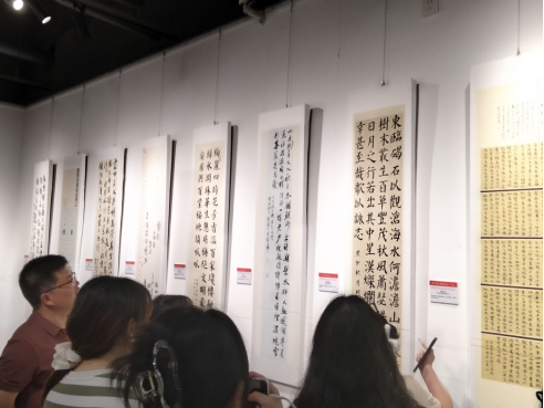 在茂德古城中设有专门的陈列馆,来陈列各式各样书法作品,其中包括行书,草书,篆书等等。陈华老师向我们具体讲解了每一幅书法作品中不同书体的用笔停顿及章印的规范使用,使得我们对于书法作品有了更进一步的了解。而其中最令我们感兴趣的则是篆书,我们决定在研学归校之际,深入探讨学习。