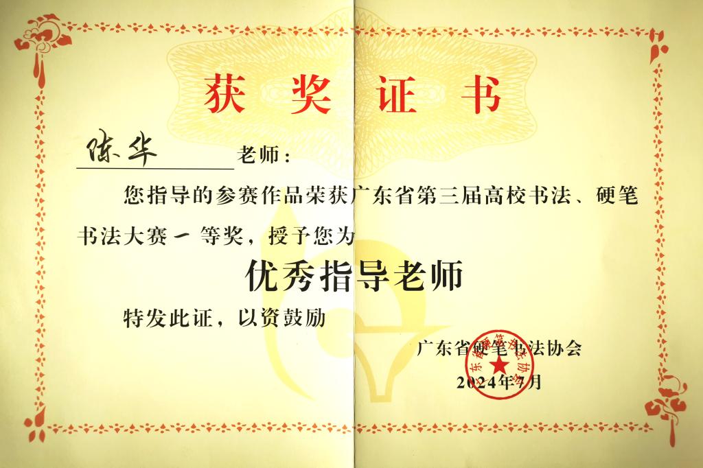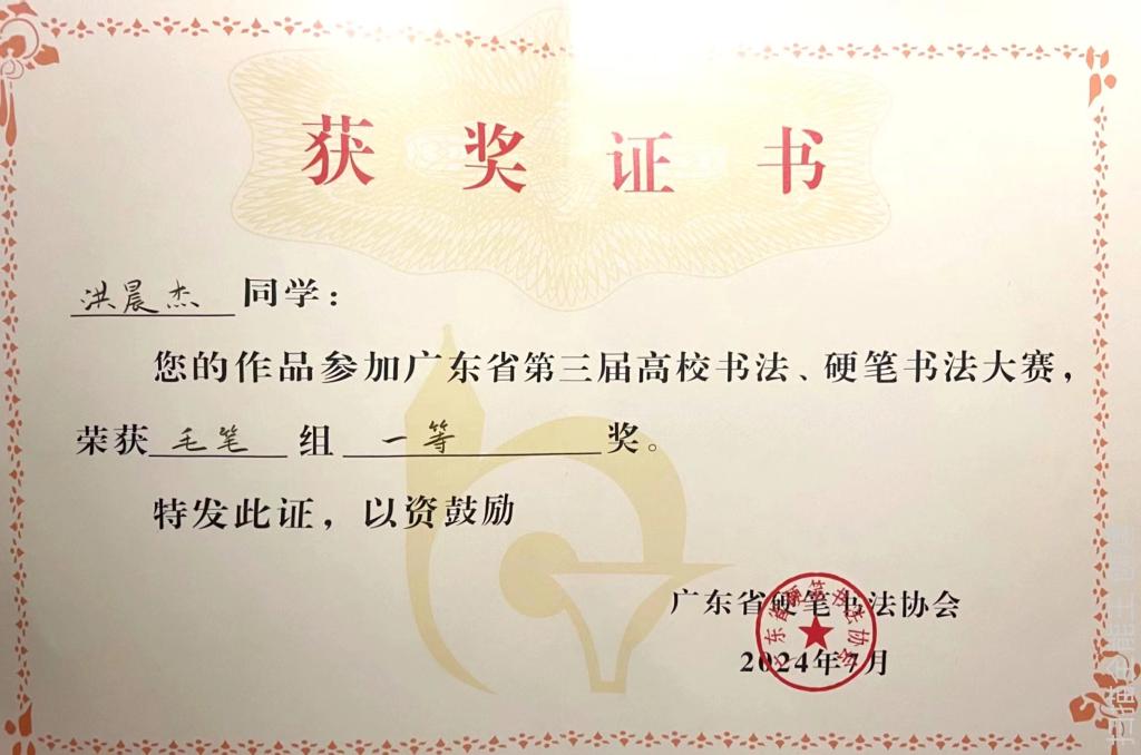 近日,公司洪晨杰同学(2021级机械设计制造及自动化1班)在广东省第三届高校书法、硬笔书法大赛中荣获毛笔组一等奖。指导老师是伟德国际victor1946的陈华老师。