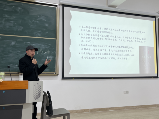 最后,周经理讲述了狂欢理论与后现代文化之间的联系,即后现代主义所追求的非中心、非本质等与巴赫金以中世纪民间狂欢文化解构教会官方文化的追求一致。他用了许多例子介绍了狂欢广场的后现代化的体现,如生活中的狂欢、文学中的狂欢、影视传媒中的狂欢等。讲座结束时,周经理播放了一首《罗刹海市》结束了这一场绘声绘色的讲座。