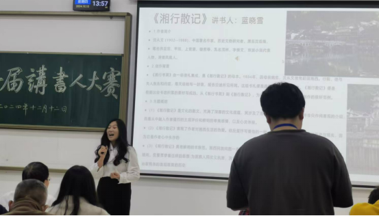 在比赛过程中,十三位历经层层考验闯入决赛的选手以高超的艺术造诣和对经典书籍的深刻理解,为现场观众呈现了一场场精彩绝伦的说书表演。罗诗婷同学由小见大,从讲述其对《论语》的深刻见解入手,探讨到传统文化对当下中国的深远意义;李嘉怡同学借《城南旧事》诉说了对人生的深刻感悟;李秀萍同学透过美国黑人文学《宠儿》中的种族歧视问题谈及当下中国和谐稳定的发展局面;蓝晓雪同学通过《湘行散记》中的篇篇散文,带领全场观众领悟了其中深厚的民族文化底蕴……选手们精彩的说书表演赢得了观众们一阵阵热烈的掌声。在赛后的专家点评环节里,本次说书人大赛的指导老师郭敏老师在追忆了这一路备赛的艰辛与幸福之后,对十三位选手的精彩表现进行了深入细致地点评与建议。