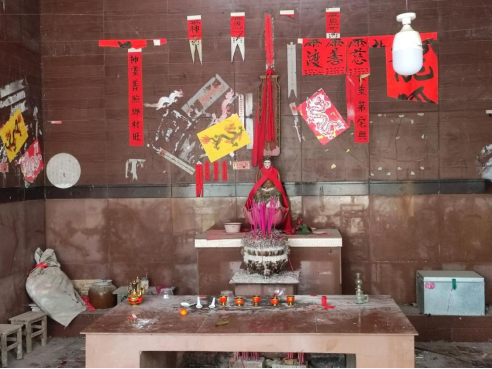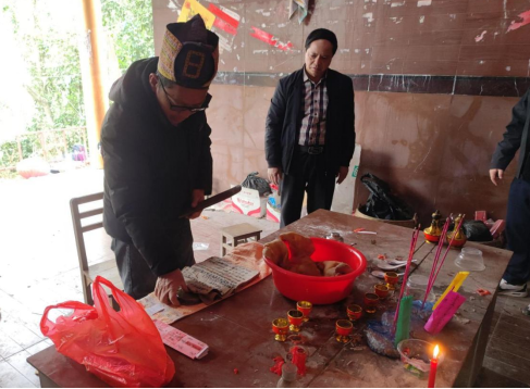 此外,课题组还前往平果市太平镇感圩屯,拜访了当地著名的花婆庙。花婆是壮族民间信仰中的重要神灵之一,是掌管生育和儿童成长的神灵。花婆庙作为祭祀花婆的场所,在当地具有极高的地位和影响力,也是壮族民俗文化的重要载体。课题组同前来供奉的村民进行深入交流,进一步了解了花婆信仰在壮族社会中的深远影响。同时,课题组还观看并记录了本地巫师“麽公”在庙中施法的过程。麽公是壮族民间信仰中的重要人物,他们负责主持各种祭祀和祈福活动,是连接人与神灵之间的桥梁。在施法过程中,麽公通过念咒、舞蹈等方式与神灵沟通,祈求神灵保佑村民平安吉祥,展现了壮族宗教文化的独特魅力。
