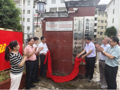现场举行揭牌仪式:巴畴乡党委书记毛照鲜(右三)与覃守达教授(左四)共同揭牌