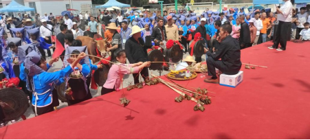 “牛魂节”是壮族同胞感恩耕牛、敬畏自然的千年传承,更是巴畴乡以文化振兴赋能乡村振兴的生动实践。“牛魂节”源于古代壮族“万物有灵”的信仰,敬牛仪式是壮族“牛魂节”的核心环节,村民们依次为牛洗澡、梳毛、喂食,并在牛角上系上红绳,表达对牛的敬意和祝福,体现了壮族人民对耕牛的感恩之情。通过敬牛仪式,壮族人民祈求牛儿健康长寿、农事顺利、五谷丰登。覃守达教授、覃祥周教授及其夫人韦淑英所组成的“壮韵组合”,上台表演了精彩的山歌节目——《四月八来共欢乐》。
