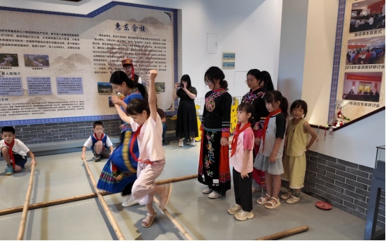 “咚——哒——咚咚——哒”随着竹竿有节奏的开合敲击,大家身穿着双色相间的传统服饰在竹竿间跃动着,灵巧地穿梭于竹竿阵中。竹竿的“咚哒”开合声也吸引来了众多畲族小学中的孩子们。当询问谁会敲竹竿谁会跳竹竿舞时,小员工们都应声道:“我会!我会!让我来!”