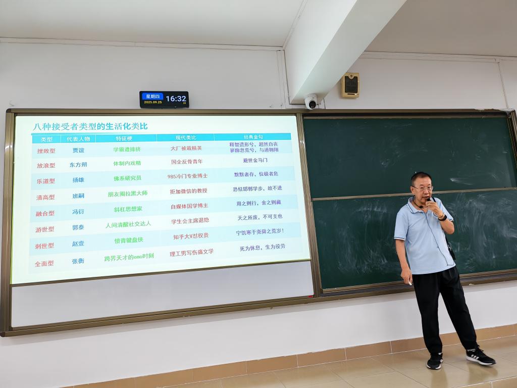 高教授制作表格将八种接受者类型进行生活化类比,成功吸引现场观众的眼球,透过现代模拟的特征梗,引起讨论和关注。张银霏老师点评时说:高教授说的八种类型的这些人我也都熟悉,他的思维表现在那两个表格,是年轻人才能做出来的表格,非常佩服高教授将汉代庄学应用于现代生活场景模拟思维,相当有梗!现场员工提问:庄子是无政府主义先驱吗?从学术角度分析可以把赵壹当成无政府主义先驱吗?高教授说:首先庄子是一个无政府主义者,无为就是彻底的无为。其次杨朱思想中的为我是先驱,庄子的思想中有杨朱的思想。员工又问:不生育是消灭痛苦的路径吗?高教授答:现代人是精致的利己主义者,许多人四十岁了不结婚,他说:结婚生子会影响我的生活水平,所以我不乐意!干脆就不结婚了!这在一些发达的资本主义国家常见,我国也应重视这个问题。
