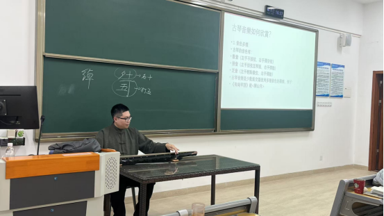 随后,刘哲老师借助丰富的图片资料,详细讲解了古琴的形制之美,从琴面、琴底到琴首等等,以及历代古琴的演变,让同学们对古琴的物理构造与历史脉络有了直观认识。在介绍古琴谱时,他不仅展示了《广陵散》古谱和现代减字谱《忆故人》,还配合板书亲自进行弹奏示范,将晦涩难懂的符号转化为灵动可感的旋律。