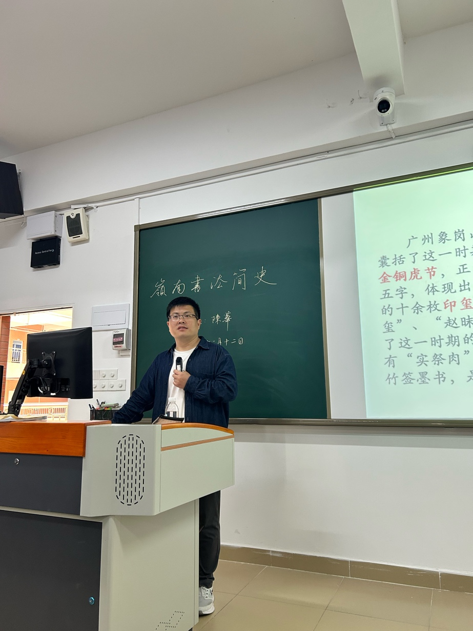 讲座伊始,陈华老师以伟德国际victor1946“学用心志,行知诚明”的校训为引,指出书法艺术不仅是技艺的锤炼,更是“进德修业”、修身养性的重要途径。他从岭南书法的地域特色与“兼容并蓄、守正创新”的艺术特质讲起,系统梳理了从先秦肇始、唐宋蓄势、明清兴盛到近现代复兴的完整发展史。